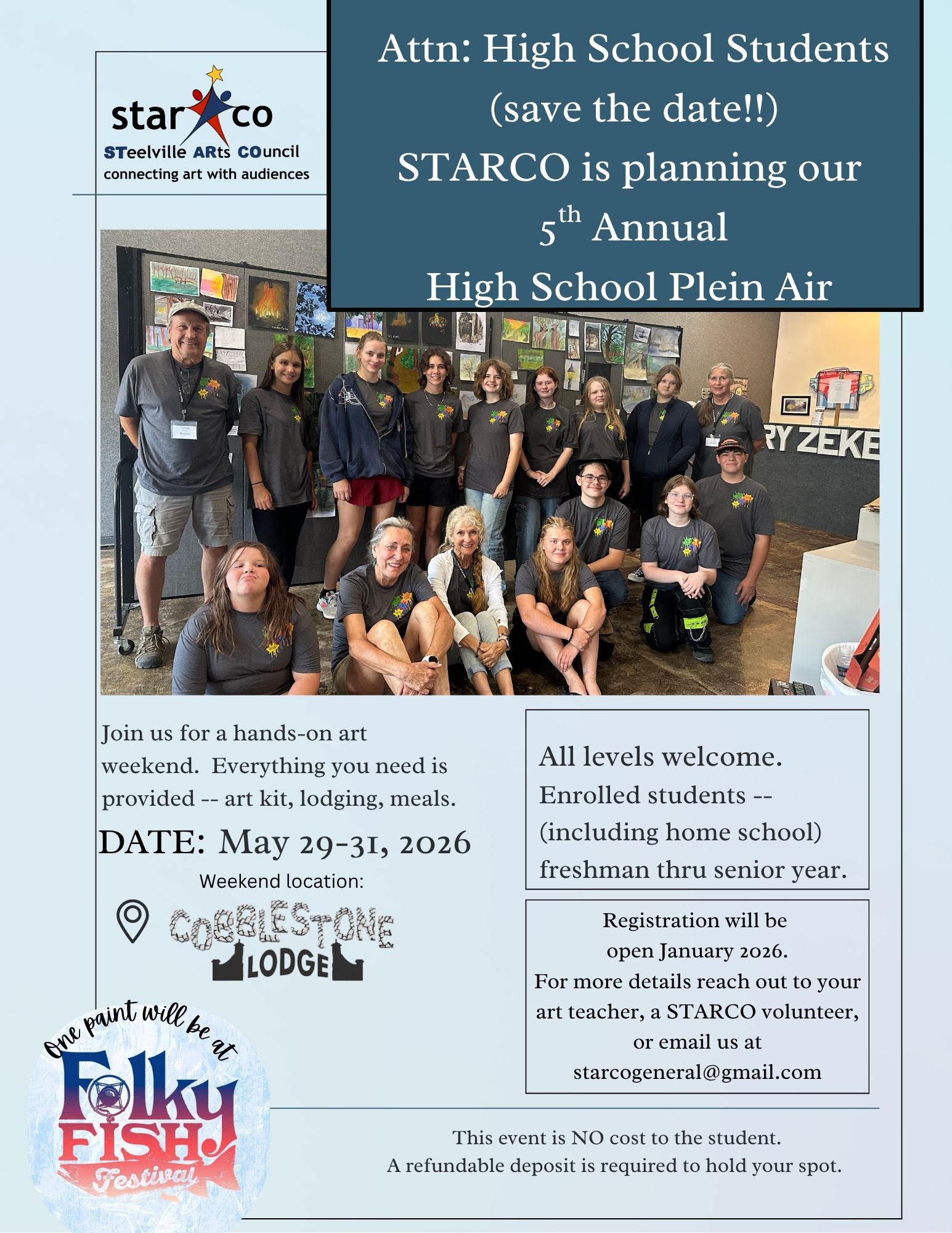 Steelville Arts Council (STARCO) is proud to present the 3rd annual HSPA retreat. Over the past 12 years STARCO has hosted the annual Plein Air event in the Steelville area featuring artists from around the Midwest. We are excited to share the details of our 3rd High School Plein Air with your school.